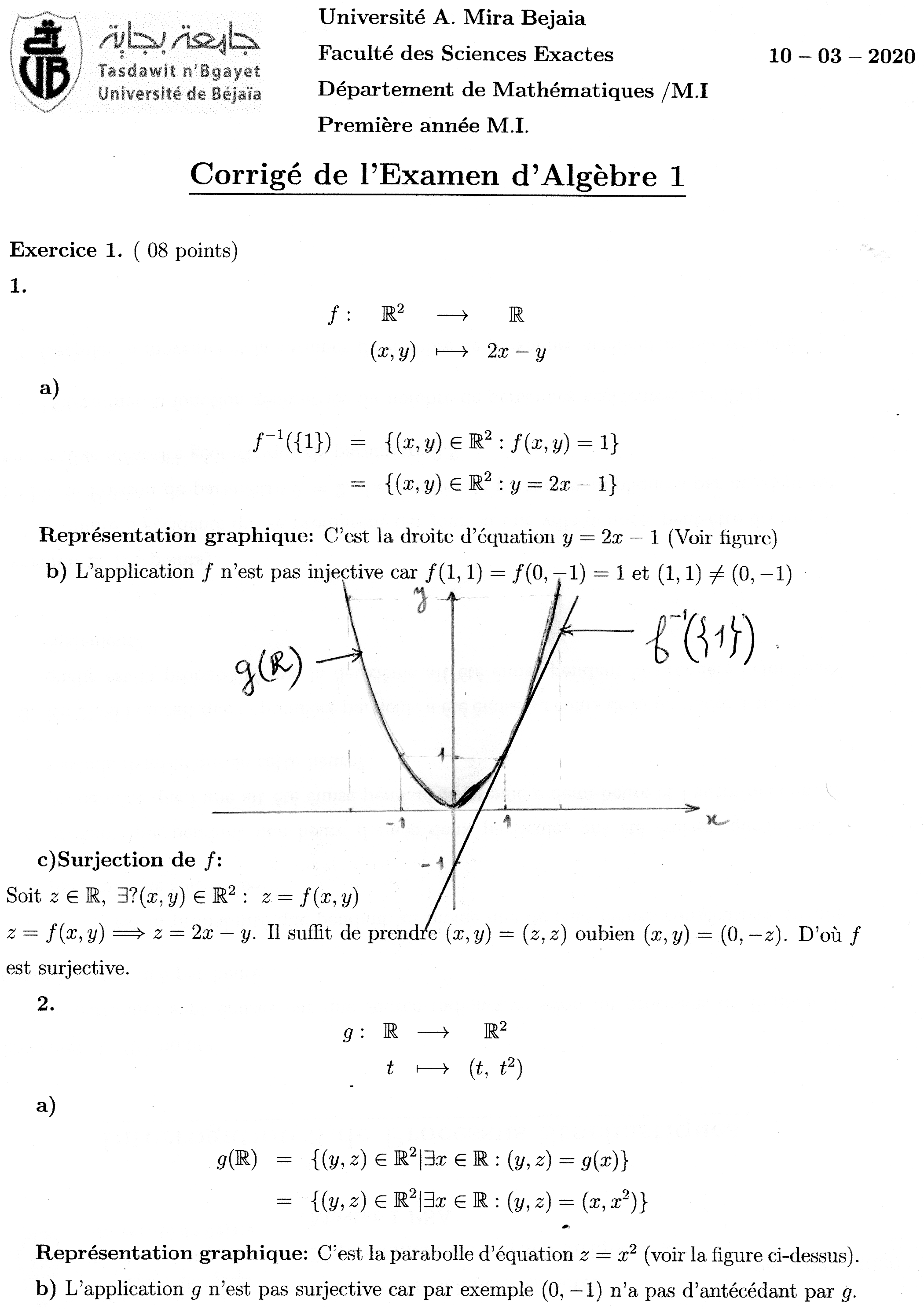 Corrigé de l'Examen d'Algébre 1, Bejaia 2020